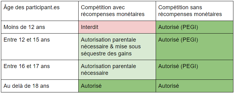 À noter également que la participation des mineurs de moins de 12 ans à ces compétitions est interdite et que celle des mineurs de moins de 16 ans est strictement encadrée.