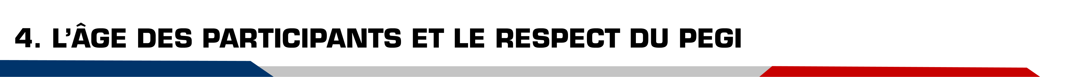 Concernant l’âge des participant.e.s et notamment des mineur.e.s de moins de 16 ans et 12 ans, nous vous invitons à vous référer au texte général relatif à l’organisation de compétition esportive. Il est aussi fortement recommandé de respecter les normes PEGI en vigueur.