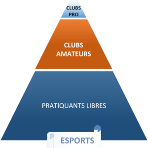 En 2020, France Esports se donne pour mission de structurer la pratique esportive amateur afin de répondre aux besoins du secteur. Le besoin principal est d’encadrer la pratique de manière responsable en vue de protéger au mieux les joueurs tout au long de leur évolution dans la pyramide de pratiques visible ci-dessous. Les besoins secondaires sont d’encadrer et de supporter le développement des modèles économiques associatifs et professionnels en accompagnant le développement de la filière esport, d’encadrer la formation des formateurs, de mettre en place des cahiers des charges permettant d’homologuer des lieux, des événements et des centres de formation. Le but est de protéger les joueurs et de promouvoir une montée en qualité globale des prestations, ainsi que de créer une voie claire d’accès à la professionnalisation pour les pratiquants qui ne se traduit pas par un décrochage scolaire ou une déscolarisation tout en imaginant les mécaniques de reconversion en réponse à la courte durée des carrières professionnelles.